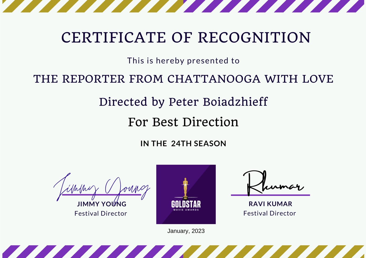 We received a festival award by Gold Star Movie Awards, February 2023, Newark, New Jersey.